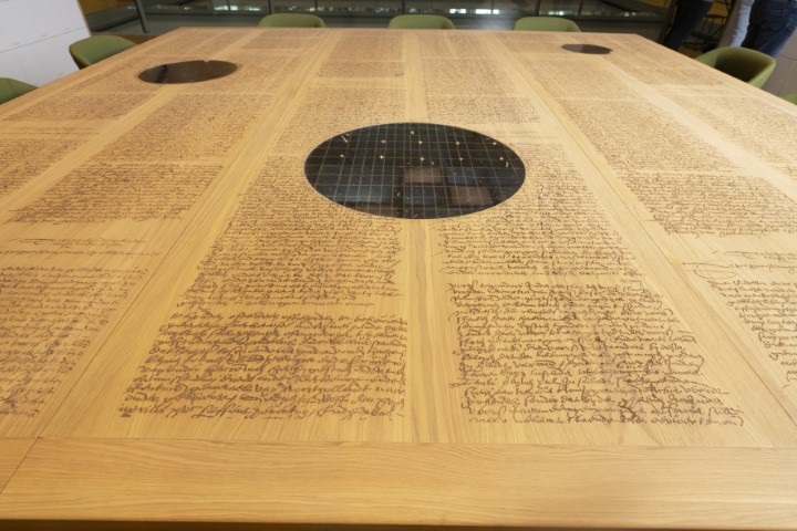De imposante nationaal erfgoed tafel Akte van Redemptie brengt dit verhaal tot leven. Speciaal ontworpen met een innovatief lichtgewicht #greengridz tafelblad van 3 meter 40 bij 3 meter 40. Afgewerkt met een eiken fineer en 10 centimeter massief houten herlijst van Haags eiken met facet aan de bovenzijde. Op het blad is de Akte van Redemptie in het fineer gelaserd over de volledige oppervlakte van het blad. Drie cirkels zijn in het blad gefreesd waardoor de #greengridz constructie zichtbaar is. Binnenin de cirkels ligt de aarde van het Malieveld waardoor het werkelijk een onderdeel is van de tafel en het verleden en het heden met elkaar verbonden zijn. De gehele bladconstructie ligt op een 3D geprint onderstel gemaakt van de afval reststromen van Hollandse Hennep waarbij de patronen verwijzen naar het Haagse Bos zonder exact op bomen te lijken.
